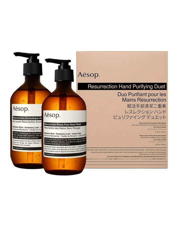 Product Ingredients: Resurrection Hand Wash 500mL Water (Aqua), Sodium Laureth Sulfate, Cocamidopropyl Hydroxysultaine, PEG-40 Hydrogenated Castor Oil, Glycerin, Phenoxyethanol, Citrus Nobilis (Mandarin Orange) Peel Oil, Sodium Chloride, Cedrus Atlantica (Cedarwood) Bark Oil, Lavandula Angustifolia (Lavender) Oil, Citrus Aurantium Dulcis (Orange) Oil, Sodium Dehydroacetate, Rosmarinus Officinalis (Rosemary) Leaf Oil, Citric Acid, Limonene, LinaloolResurrection Rinse-Free Wash 500mL Alcohol Denat., Water (Aqua), Glycereth-26, Coceth-7, PPG-1-PEG-9 Lauryl Glycol Ether, Trideceth-9, Acrylates Copolymer, PEG-40 Hydrogenated Castor Oil, PEG-5 Ethylhexanoate, Citrus Nobilis (Mandarin Orange) Peel Oil, Cedrus Atlantica (Cedarwood) Bark Oil, Lavandula Angustifolia (Lavender) Oil, Citrus Aurantium Dulcis (Orange) Oil, Aminomethyl Propanol, Rosmarinus Officinalis (Rosemary) Leaf Oil, d-Limonene, Linalool. This ingredient list is subject to change, customers should refer to the product packaging for the most up-to-date ingredient list.