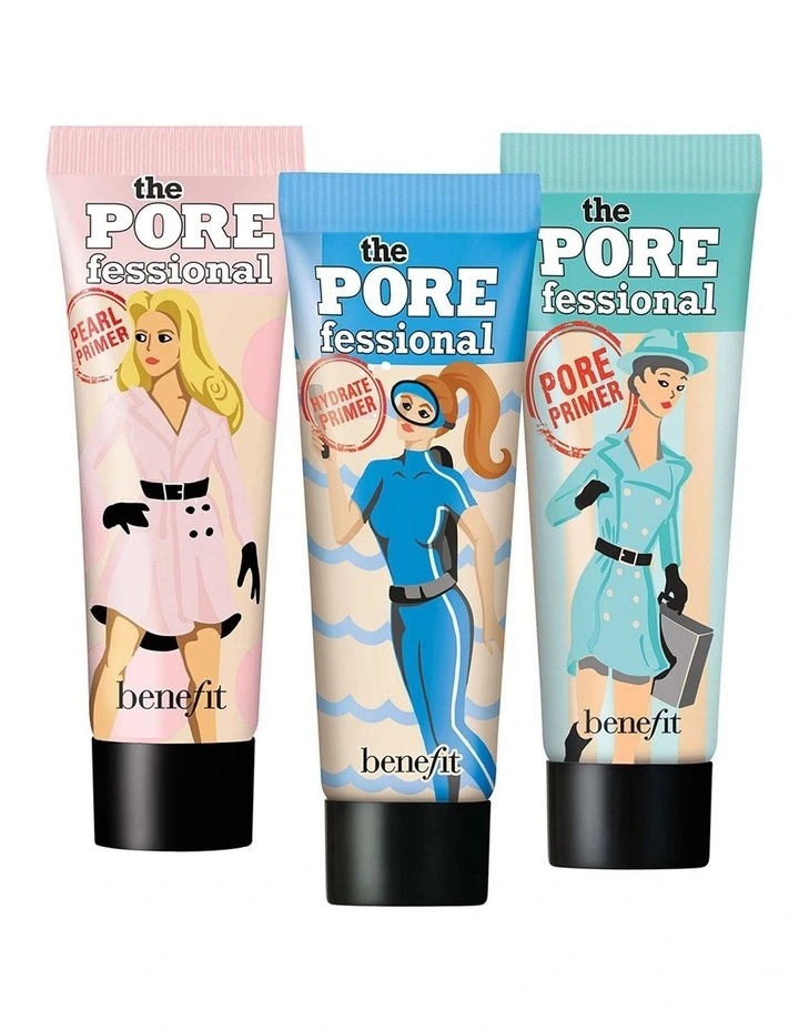 Fight all your pore problems like a pro with this MINI trio of Benefit primers! Minimize the look of pores & fine lines and create a smoother-than-smooth canvas for makeup with each of these Benefit POREfessionals. Includes our original #1 face primer, soft-radiance primer for brighter looking skin and NEW hydrating primer for a boost of moisture.