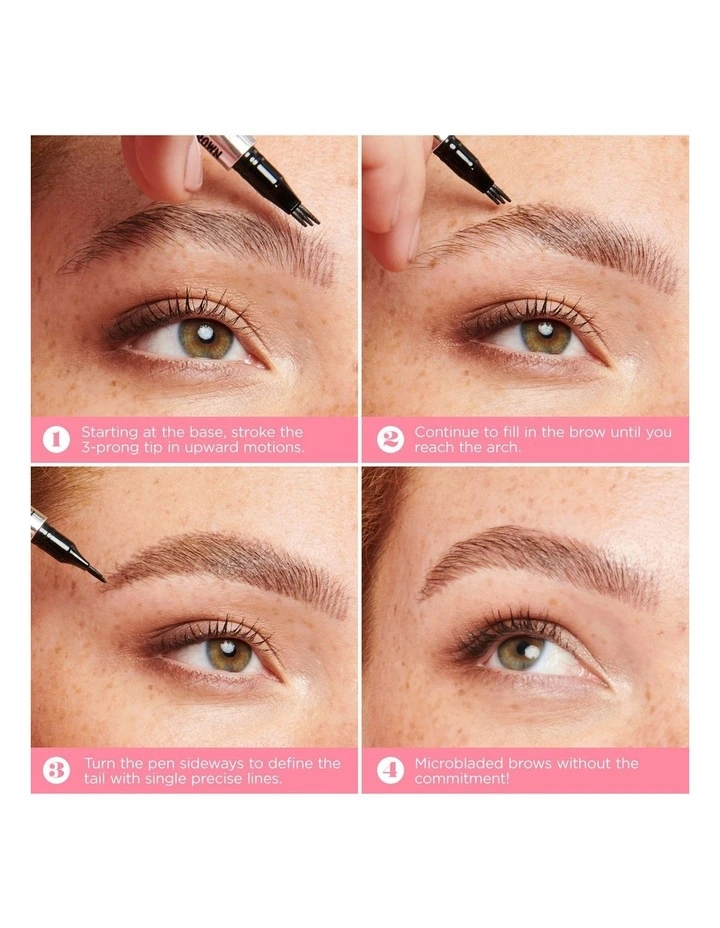 How To Use: Microfilled & Mighty Fine Stroke the 3-prong tip along clean, dry brows in short, upward motions to fill. Turn the pen sideways to draw a single fine line and define the tail.